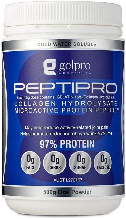 GelPro Peptipro Collagen Hydrolysate Beef Gelatin contains 96% Protein. This is a premium grade Collagen Hydrolysate - Cold Water Soluble. It is unflavoured and has superior bioavailability and excellent solubility.