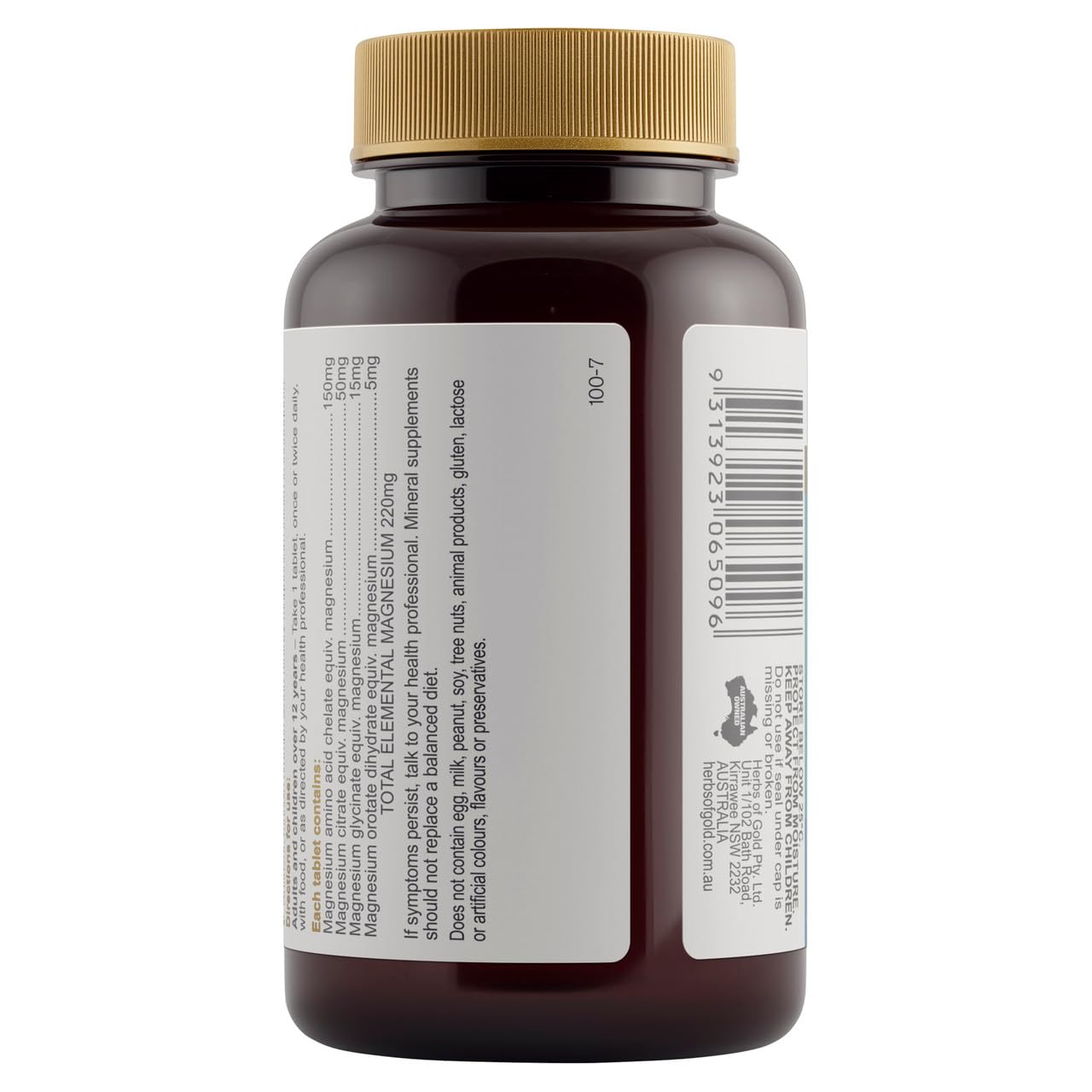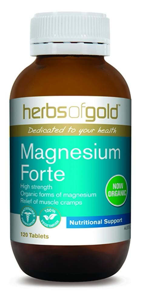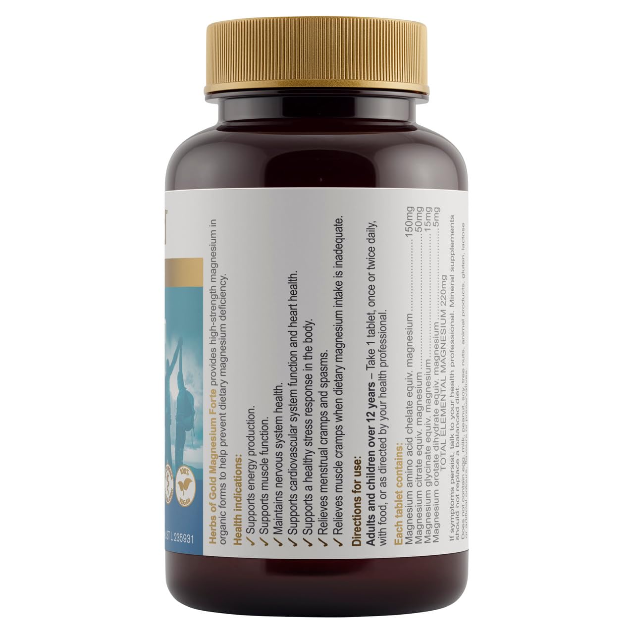 Herbs of Gold Magnesium Forte is a high strength magnesium supplement provided in organic forms to assist in the prevention of magnesium deficiency when dietary intake is inadequate. Magnesium is required for energy production and is important in maintaining energy levels. It helps the body metabolise carbohydrates, proteins and fats and is helpful in maintaining healthy blood glucose in healthy individuals.