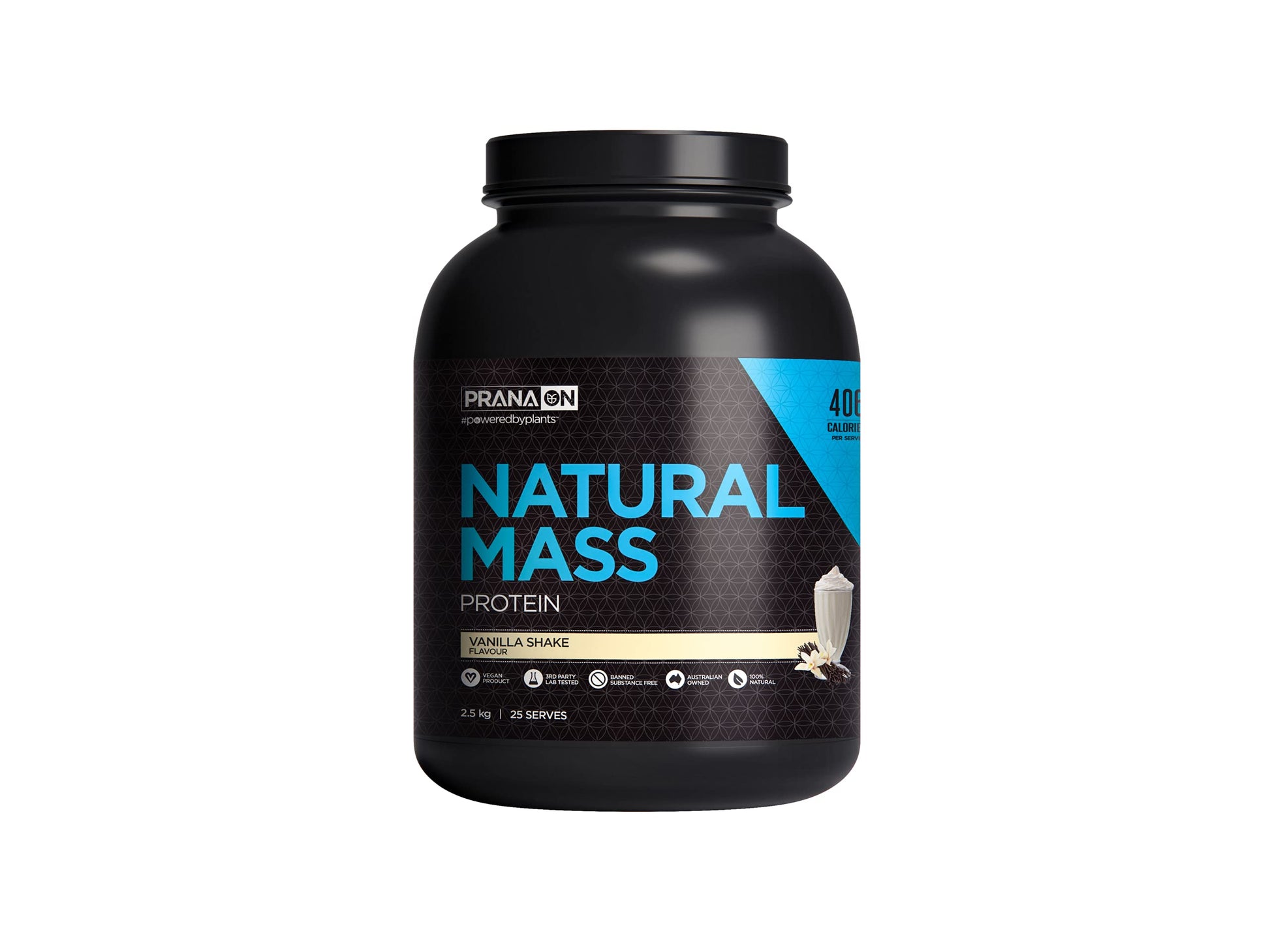 PranaON Natural Mass Vanilla Shake Protein Supplement is the ultimate mass gainer stacked with both complex and simple carbohydrates, three plant based protein sources and healthy fats from coconut MCTs and flax. With added creatine, glutamine and branch chain amino acids, this blend is designed to boost muscle gains and accelerate recovery for maximum results. Natural Mass Protein is specifically formulated with an optimum balance of macro nutrients to support those looking to add lean mass the healthy way.