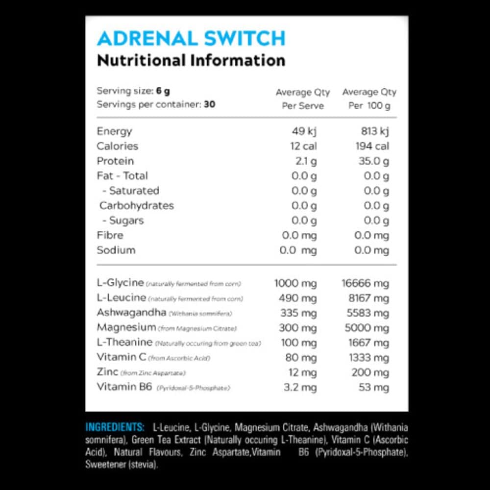 Switch Nutrition Adrenal Switch Chocolate Flavoured Magnesium Support Formula with the perfect combination of standardized Ashwagandha, bio-available Magnesium, Zinc, Vitamin B6, L-Theanine, L-Leucine and L-Glycine to lower cortisol, support incredible sleep, reduce body fat, increase strength and recovery. Switch Nutrition has combined all these ingredients into one incredible tasting formula for superior results, convenience and affordability. Adrenal Switch is 100percent naturally sweetened with stevia and contains ZERO artificial colours or preservatives. It is designed to support healthy adrenal function. It will relax the sympathetic (stress) nervous system and engage the para-sympathetic (rest and digest) nervous system. This makes Adrenal Switch perfect for people suffering from stress, anxiety, hypertension, mood disorder or adrenal fatigue.