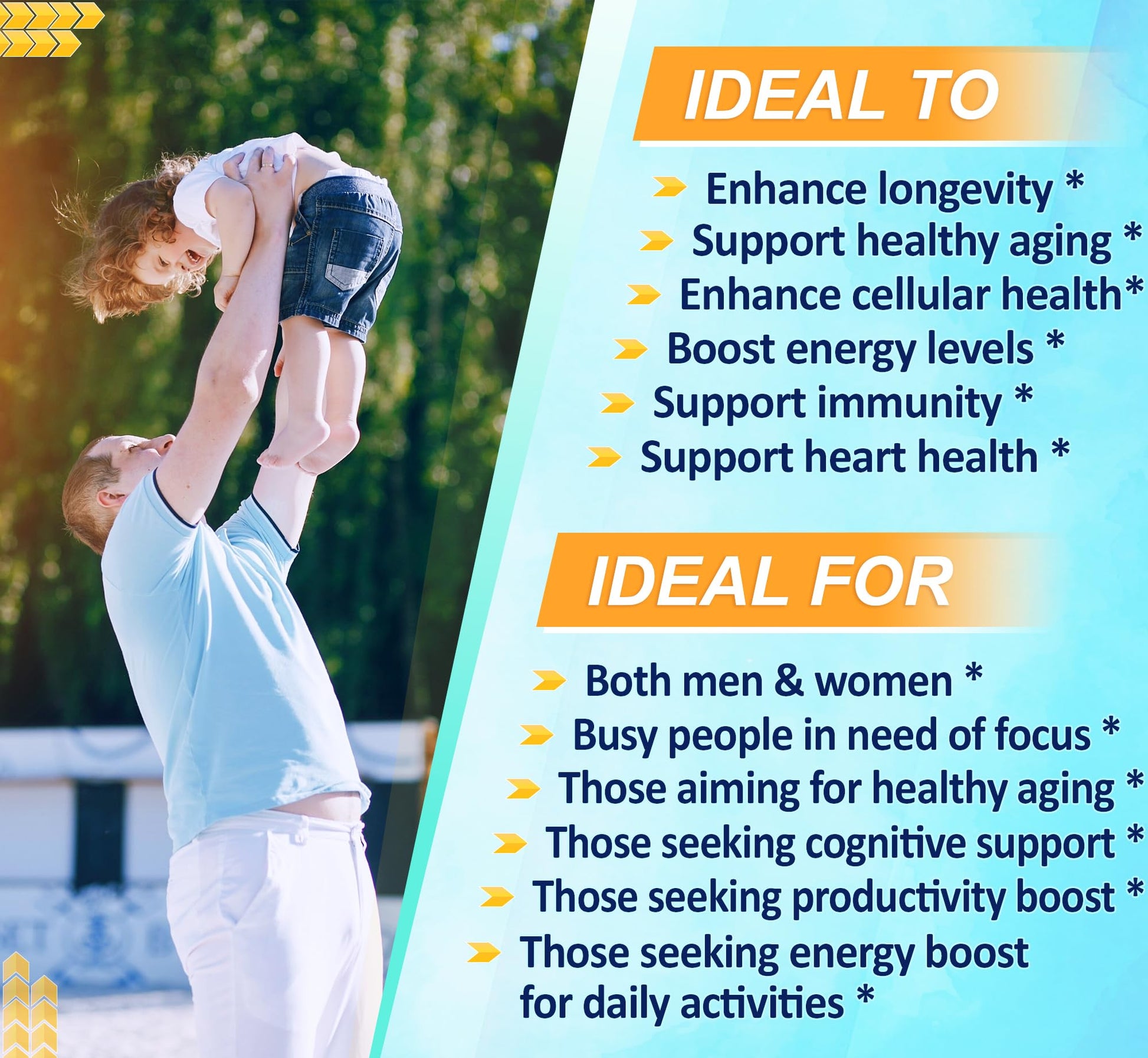 • Highest Potency Formula: Each serving delivers the equivalent of 11500mg of powerful herbal ingredients, including Resveratrol, NMN, and Quercetin.